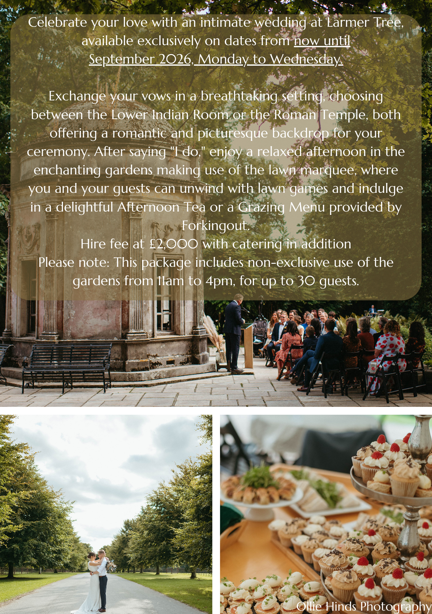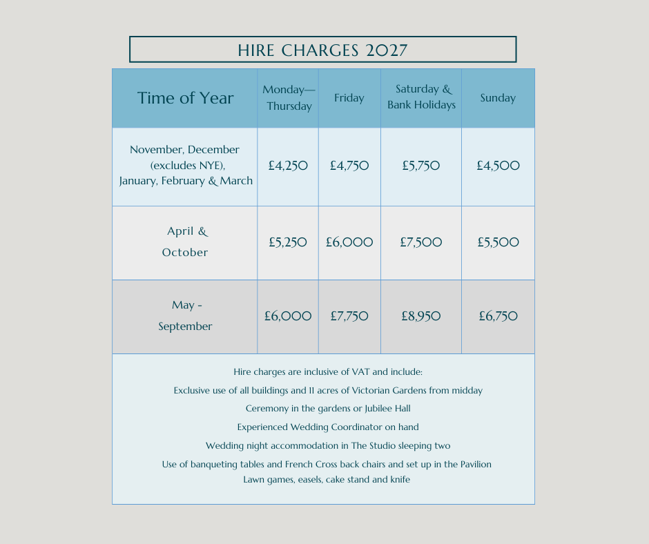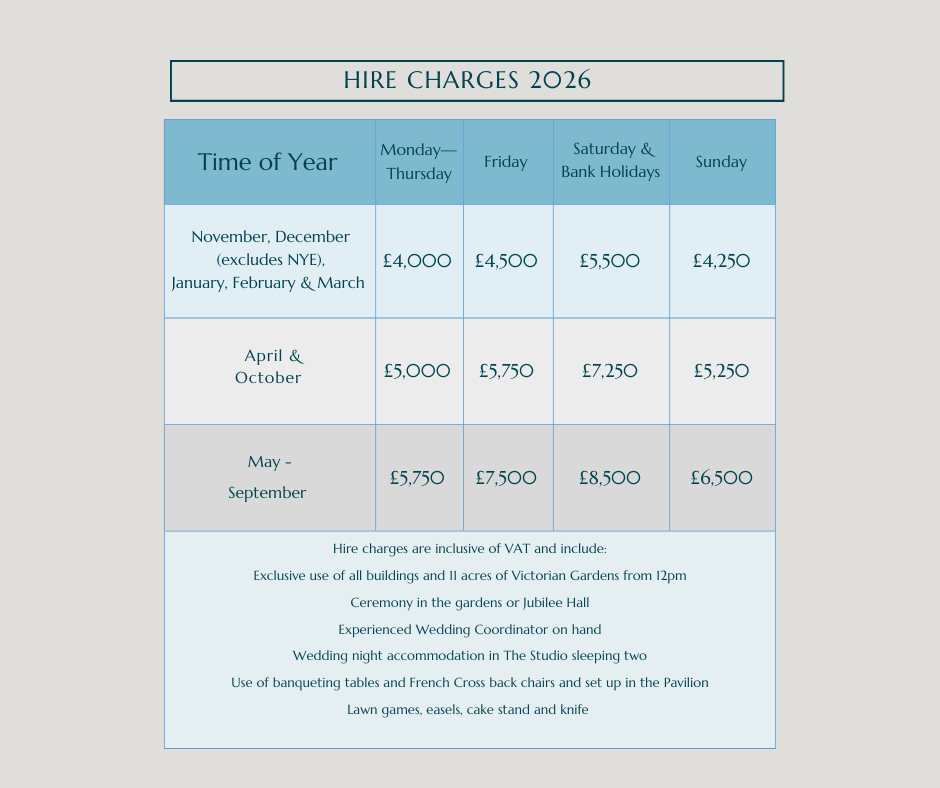 Costs for venue hire vary depending on the day of the week and time of year. Prices and availability are detailed below. It’s worth noting that catering costs and accommodation at the Larmer Tree will be charged in addition to the price quoted for the venue hire.